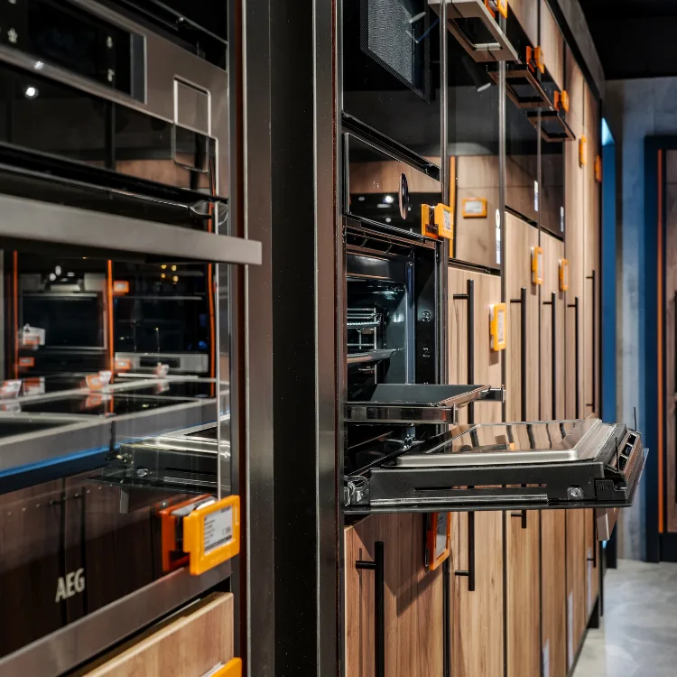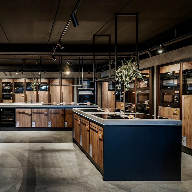 Auf Grundlage eines Konzeptentwurfs eines unserer Innenarchitekten wurde für den Auftraggeber eine zeitgemäße Einbau-Ecke realisiert, die zur charakteristischen Ausstrahlung von Expert passt. In diesem Bereich wurde funktionsfähige Küchentechnik integriert, sodass der Raum nicht nur als Präsentationsmöbel dient, sondern auch für Demonstrationen genutzt werden kann.