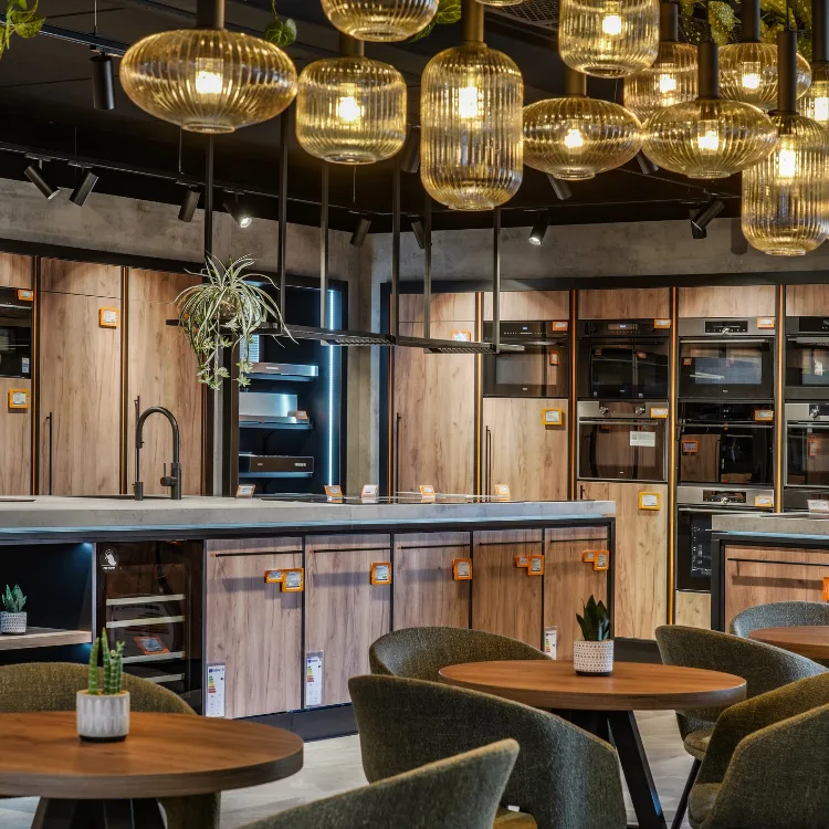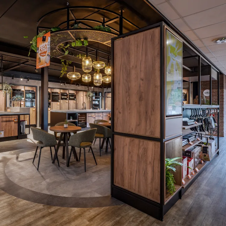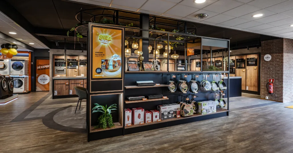 Für Expert Doornenbal Nijverdal haben wir eine vollständige Erneuerung der Einbau- und Kaffee-Ecke realisiert. Im Einklang mit der wiedererkennbaren Corporate Identity von Expert wurde ein funktionales Design entwickelt. Zusätzlich entwarfen wir einen maßgefertigten Schrank mit integriertem Bildschirm, in dem Produkte aus der Kategorie „Kochen“ übersichtlich präsentiert werden.