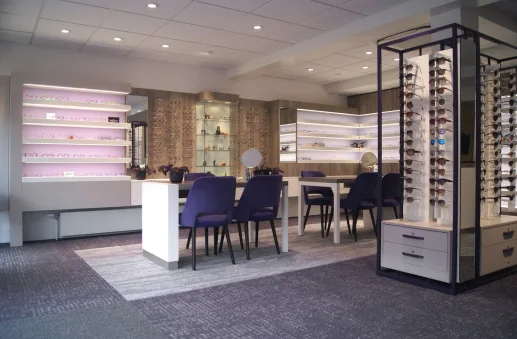 Für Westerhof Optiek in Beilen durften wir zur Neugestaltung des Geschäfts beitragen, wobei die Farbe Lila auf subtile Weise in das Konzept integriert wurde.